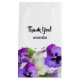 An elegant white background and a border of violet, purple and white watercolored pansies. Black hand lettered style script and the text: Thank You! Template for a name. Perfect as a favor box for birthdays , anniversaries or weddings.