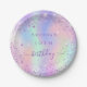 A girly trendy iridescent background with unicorn and rainbow pastel colors in pink, purple, rose gold, mint green. Decorated with faux glitter dust. Personalize and add a name and age. The word birthday is written with a modern hand lettered style script.