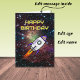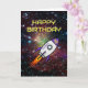 The star-filled background on the front of this one-of-a-kind birthday card uses an image of the 'dumbbell nebula' created by the NASA Spitzer telescope. The purple-colored rocket has editable text so you can enter the name and age you require. The message inside can also be customized, or you can use "Wishing you a birthday that is out of this world!"