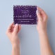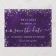 A glamorous Save the Date for a 50th (or any age) birthday party. A purple uneven colored background. Decorated with faux silver glitter dust. The text: Save the Date is written with a large trendy hand lettered style script.