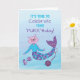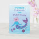A pink and purple mercat is swimming in a blue ocean. Sparkly looking gems on the tail and necklace add some digitally created fun! Celebrate a special “purr”th - day with this purrmaid birthday card!