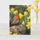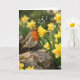 A robin sits on a rock surrounded by vibrant yellow daffodils, playfully singing into one as if it were a microphone, illustrated by whimsical musical notes
