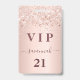 A modern, stylish and glamorous badge for a 21st (or any age) birthday party. A modern, stylish and glamorous badge for a 21st (or any age) birthday party. A rose gold background with rose gold confetti. With the text: VIP. Personalize and add name, age, address/date. The name is written with a modern dark rose gold colored hand lettered style script with swashes.