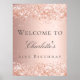 A welcome poster for a girly and glamorous 21st (or any age) birthday party. A rose gold gradient background decorated with confetti. Personalize and add a name and age 21. Gray letters.