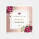Elegant and timeless for a 50th (or any age) birthday party. A chic rose gold faux metallic looking background with a simple rose gold and white frame. Decorated with florals, roses in burgundy and rose gold. Personalize and add a date , name and age 50. The name is written with a hand lettered style script. Black and golden letters.