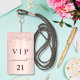 A modern, stylish and glamorous badge for a 21st (or any age) birthday party. A rose gold background with drips, paint drip look. The name is written with a modern dark rose gold colored hand lettered style script with swashes. With the text: VIP Number 21 is written in a golden color. To keep the swashes only delete the sample name, leave the spaces or emoji's in front and after the name.
