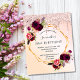 On front: An invitation for a 50 years old, 50th (or any age) birthday party. A rose gold, blush pink colored ombre background with a faux gold geometric frame. Decorated with dark purple and burgundy flowers, roses and boho style feathers. Faux rose gold glitter drips. Templates for a name and party details. The name is written with a hand lettered style script, gray colored letters.