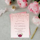 A girly and feminine 21st (or any age) birthday party invitation. On front: A rose gold and blush pink gradient background. Decorated with rose gold faux glitter drips and burgundy and rose gold colored flowers. Personalize and add a name and party details. The name is written with a hand lettered style script, dark rose gold colored letters.