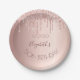A paper plate for a girly and glamorous 50th (or any age) birthday party. A rose gold colored background with rose gold drips, paint drip look. The text: The name is written in dark rose gold with a large modern hand lettered style script. Template for name, age 50 and a date.