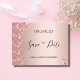 An elegant and simple Save the Date card for a Quinceañera, 15th (or any age)birthday party. A chic rose gold faux metallic, foil looking background decorated pink and rose gold watercolored botanical florals. Templates for a date and name/age. Black colored letters. The text: Save the Date is written with a large trendy hand lettered style script.