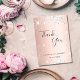 A thank you card for a 50th (or any age) birthday. A rose gold faux metallic looking background, decorated with faux silver glitter. On front, a large hand lettered script and the text: Thank You, your text, title and a date.