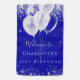 A welcome sign for a girly and glamorous 21st (or any age) birthday party. A royal blue background with elegant faux silver dust and white balloons. Personalize and add a name and age 21. White letters.