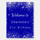 A welcome board for a girly and glamorous 21st (or any age) birthday party. A royal blue background with elegant faux silver dust. Personalize and add a name and age 21. White letters.