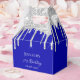 Elegant, classic, glamorous and girly for a 21st (or any age) birthday party favors. A royal blue background. On the front and the back: Personalize and add a name, age 21 and a date. The name is written with a modern hand lettered style script. Decorated with faux silver glitter drips, paint dripping look. White colored text.
