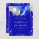 A royal blue background. Decorated with faux silver glitter drips paint dripping look, sparkles and balloons. Personalize and add a name and party details. The name is written with a hand lettered style script.