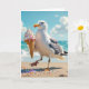 A seagull stands on a sandy beach holding a melting ice cream cone topped with colorful sprinkles.