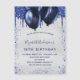A girly and feminine 18th (or any age) birthday party invitation magnet. On front: A faux silver background. Decorated with navy blue faux glitter drips, paint dripping look and balloons. Personalize and add a name and party details. The name is written with a hand lettered style script.
