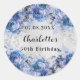 A faux silver looking background decorated with faux glitter, sparkles and blue flowers. Personalize and your name and the party date.