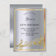 A trendy, modern 50th birthday party invitation card. A faux silver metallic looking background, with faux gold frame and music notes, black colored letters. Personalize and add a name and party information.