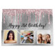 For a girly and glamorous 21st (or any age) birthday. A faux silver metallic looking background with pink faux glitter drips, paint dripping look. Personalize and add 3 photos and age 21. Black text.