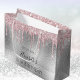 A gift bag for a girly and glamorous 21st (or any age) birthday. A faux silver looking background with pink faux glitter drips, paint dripping look. Personalize and add a date, name and age 21. The text: The name is written in black with a modern hand lettered style script.
