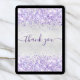 A feminine and elegant birthday thank you card. A faux silver looking background color. With purple, violet faux glitter, sparkles. On front large hand lettered script and the text: Thank You.