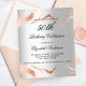 A faux silver looking background. Decorated with rose gold mable veins. Personalize and add a name, age and party details. The name is written with a hand lettered style script.