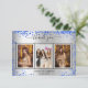 Add 3 of Your birthday photos, vertical size, a date, name, and the thank you note. A faux silver metallic looking background with black text and frame, royal blue faux glitter sparkles. The text: Thank you on the front and your name on the back are written with a stylish hand lettered script with swashes.