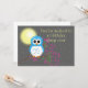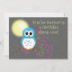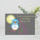 Invitation to a birthday sleepover. A cute drawing of a blue owl on a branch with a pale moon behind him and stars in the sky. A charcoal gray background. You can add your own text to the back.