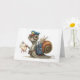A whimsical snail dressed as a postal worker, complete with a blue cap adorned with a badge, large glasses, and a backpack full of mail.
