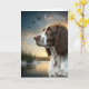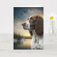 A springer spaniel dog with a brown and white coat gazes thoughtfully over a serene wetland landscape at dawn, where ducks take flight amidst tall reeds.