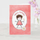 Cute stick girl with hair, red glasses, gingham dress, and holding daisies on a red and white gingham pattern for general birthday.