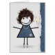 Cute stick girl in blue jean denim dress holding party sparklers on torn paper edge with blue jean denim border.
