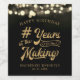 Celebrate any year birthday with these personalized black and gold wine and beverage label featuring a retro calligraphy script typography title design # YEARS IN THE MAKING that incorporates their birth year within the design, the editable title HAPPY BIRTHDAY and name and date or other custom text with a border of string lights. Contact the designer via Zazzle Chat or makeitaboutyoustore@gmail.com if you'd like this design modified, in another color, on another product or would like coordinating items.