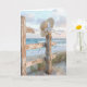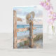 A woman's sun hat with a bow and ribbon hangs on a weathered fence post in the breeze at the beach, with an ocean surf in the background.