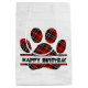 Red and black tartan plaid pet paw print with Happy Birthday text on faded white painted wood.