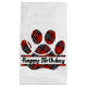 Red and black tartan plaid pet paw print with Happy Birthday text on faded white painted wood.