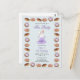 Tea party birthday invitation card in pastels and light blue, featuring a cute bunny in a tea cup, framed with donuts.