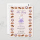 Tea party birthday invitation card in pastel pink, featuring a cute bunny in a tea cup, framed with donuts.
