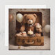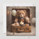 A teddy bear sitting in a vintage suitcase. In the suitcase there are 3 birthday cakes, one with one candle. There are also several balloons floating in the air around the suitcase.