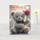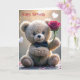 A fluffy teddy bear with a black bow tie holds a single long-stem red rose surrounded by softly glowing heart shapes.