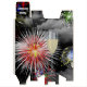 Fireworks in black sky with clouds and white wine in stemware glass for birthday.