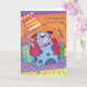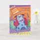 A colorful design of a dog on a greeting card surrounded by many gifts such as cake and other present for its friend.