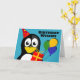 A big cute penguin wearing a birthday party hat, holding on to balloons and a gift is on the cover of this birthday card. Wish someone a big PENgrin on their face to celebrate. Art, image, and verse copyright © Shoaff Ballanger Studios, 2023.