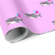 Wrapping paper with cute birthday shark with pink flower holding party balloons in pink, purple and turquoise colors. The design is customizable.