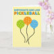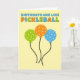 This birthday card is perfect for pickleball players. It features the illustrations of pickleball shaped balloons against a light yellow colored background. The message on the front reads "Birthdays are like pickleball." The message on the inside reads: "Everybody's going to do it at some point, and you make it look easy. Happy Birthday!"