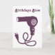 This greeting card features a simple hand-drawn style illustration of a vintage hairdryer in purple. This card is ready to be customized with your own message on the front and the inside in orange script lettering so that you can create a funny card for birthdays or any occasion.