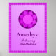 Poster in a digital illustration of an amethyst, the birthstone for February, shades of deep royal purple and violet, bordered in an amethyst crystal pattern