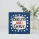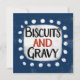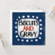 A fun and cute typographic southern food design that says "Biscuits And Gravy". It has black and red text on a white rectangle with funky, playful white dots surrounding it, all on a blue background.