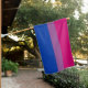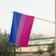 Outdoor house flag with the bisexuality pride flag. Pink or magenta, purple and blue flag of the bi pride movement